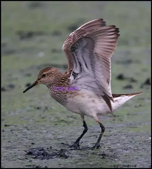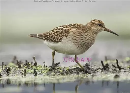 斑胸滨鹬(学名:Calidris melanotos)小中型涉禽;体长23厘米,翼展37-45厘米,体重126克。嘴形直,有时微向上或向下弯曲;鼻沟长度远超过上嘴的1/2;羽色暗淡,雌雄羽色及大小大都相同;跗蹠后侧具盾状鳞,前缘亦具盾状鳞;趾不具瓣蹼。体羽多具褐色杂斑,腿黄,嘴具两色并略为下弯,胸部纵纹密布并突然中止于白色腹部。白色眉纹模糊,顶冠近褐。繁殖期雄鸟胸部偏黑。栖息于海岸、沼泽、河川等地。飞翔力强,飞行时颈与脚均伸直。取食甲壳动物、昆虫和植物。栖于沿海滩涂及近海的稻田和鱼塘。通常与其他滨鹬及鹬类混群。潮落时跑至泥里翻找食物。休息时单脚站在沙坑,飞行迅速,成密集群。繁殖于西伯利亚东北部楚利奇半岛和北美洲北部北极地带。越冬于南美洲、美国东西海岸、夏威夷群岛、澳大利亚、太平洋中岛屿,偶尔到日本。