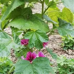 锦葵(学名:Malva sinensis Cavan.):二年生或多年生直立草本,高50-90厘米,分枝多,疏被粗毛。叶圆心形或肾形,具5-7圆齿状钝裂片,两面均无毛或仅脉上疏被短糙伏毛。花3-11朵簇生,小苞片3,长圆形疏被柔毛;花紫红色或白色,直径3.5-4厘米,花瓣5,匙形,长2厘米,先端微缺,爪具髯毛。果扁圆形,分果爿9-11,肾形,被柔毛;种子黑褐色,肾形,长2毫米。花期5-10月。