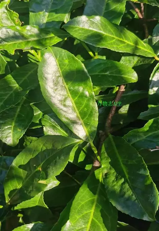 叶革质,椭圆形至矩圆形或矩圆状倒卵形至倒卵形,有时近圆形,长7-20厘米,顶端短尖至渐尖而钝头,有时钝形至近圆形,基部宽楔形,稀圆形,边缘上部有不规则浅波状锯齿或近全缘,上面深绿色有光泽,两面无毛或脉上散生簇状微毛,下面有时散生暗红色微腺点,脉腋常有集聚簇状毛和趾蹼状小孔,侧脉5-6对,弧形,近缘前互相网结,连同中脉下面凸起而显著;叶柄长1-2 (-3) 厘米,无毛或被簇状微毛。