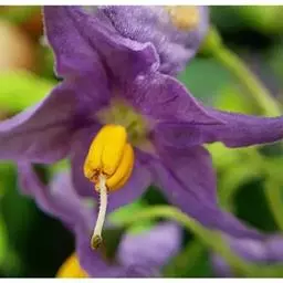 花顶生于主茎及分枝顶端,下垂;花萼裂片长三角形,裂片间有一个卵形至卵状披针形而反折的附属物,它的边缘有芒状长刺毛;花冠白色,带紫斑,筒状钟形,长3-6.5厘米,裂片有睫毛。