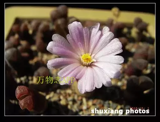 生石花,番杏科生石花属多年生肉质草本植物。植株几乎无茎;花朵较大,颜色艳丽,呈多边形,…