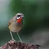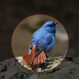 蓝额红尾鸲 小型鸟类,体长14-16厘米。雄鸟夏羽前额和一短眉纹辉蓝色,头顶、头侧、后颈、颈侧、背、肩、两翅小覆羽和中覆羽以及颏、喉和上胸概为黑色具蓝色金属光泽。其中小覆羽和中覆羽较深呈暗蓝色,腰、尾上覆羽和下体余部橙棕色或棕色,两翅飞羽和大覆羽暗褐色,羽缘淡褐色,中央尾羽黑色,外侧尾羽橙棕色或棕色具宽阔的黑色端斑。冬羽和夏羽大致相似,但头顶至背等黑色部分各羽均具棕色羽端,两翅覆羽和飞羽亦具宽阔的棕色羽缘。 雌鸟头顶至背棕褐色或暗棕褐色,腰和尾上覆羽栗棕色或棕色,中央尾羽黑褐色,外侧尾羽栗棕色具黑褐色端斑。眼圈棕白色,两翅褐色具棕黄色羽缘。头侧、颈侧、颏、喉、胸淡棕褐色,腹至尾下覆羽橙棕色。 虹膜暗褐色,嘴、脚黑色。