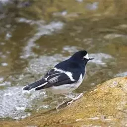 赭红尾鸲:小型鸟类,体长13-16厘米。雄鸟前额、头侧、颈侧、颏至胸概黑色,头顶和背灰色或黑色,…