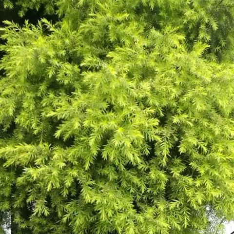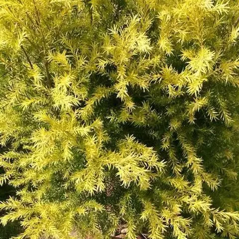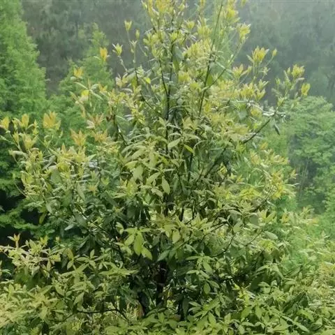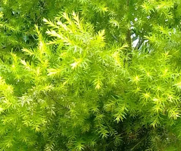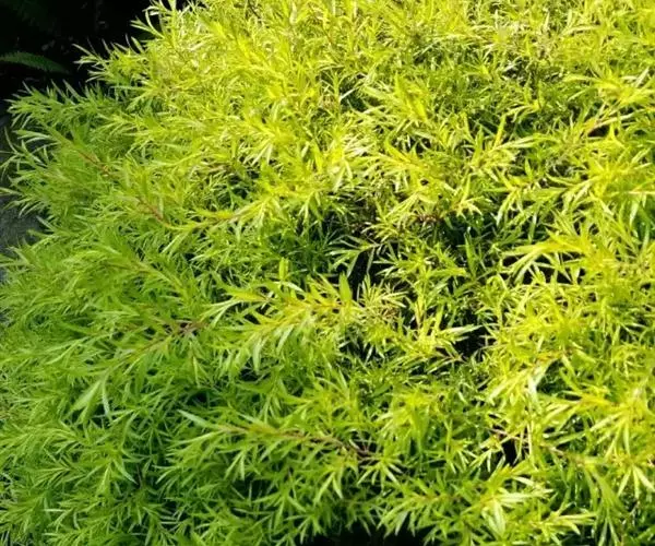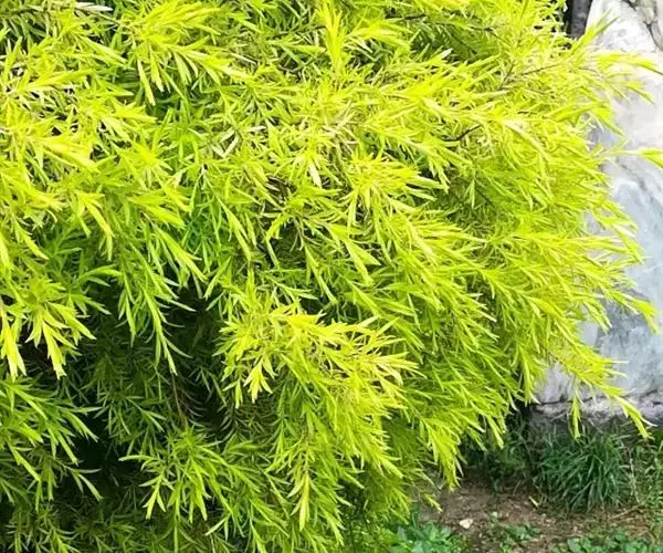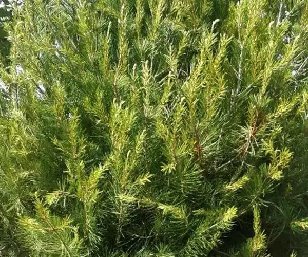 常绿乔木,树高可达6-8米,冠幅锥形。主干直立,枝条密集、细长、柔软,嫩枝红色。树皮纵裂,枝条柔软密集。叶互生,金黄色,窄卵形至卵形,长10-28毫米,宽1.5-3毫米,叶脉5-11,叶尖锐尖到尖,叶无毛或偶有软毛,无叶柄,具芳香味。穗状花序,花序有少到多个尖状花组成,长1.5-3.5厘米,花轴被软毛,同一苞片内有1到3个白色花,花瓣近圆柱形,长1.5-2毫米;每束雄蕊16-25个;花瓣绿白色。果实为蒴果。果近球形,果径2-3毫米,具有一个2毫米直径的孔,萼片宿存。 [1-2]