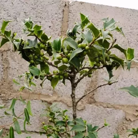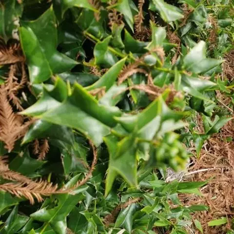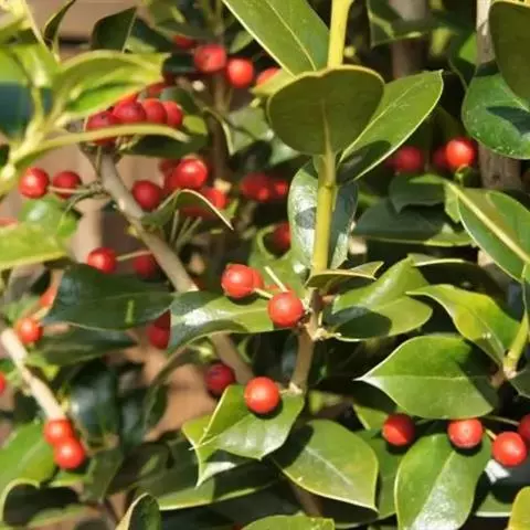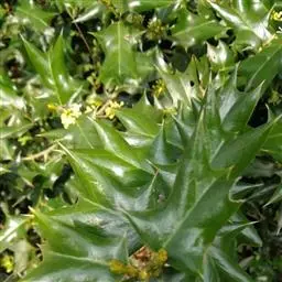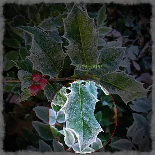 构骨叶冬青学名枸骨(Ilex cornuta Lindl. et Paxt.),又名猫儿刺、老虎刺、八角刺、鸟不宿、构骨、狗骨刺、猫儿香和老鼠树。常绿灌木或小乔木,高(0.6)1-3米,二年枝褐色,三年生枝灰白色,叶片厚革质,花淡黄色,果球形,直径8-10毫米,成熟时鲜红色,花期4-5月,果期10-12月。产于我国,欧美一些国家植物园等也有栽培,常生于海拔150-1900米的山坡、丘陵等的灌丛中、疏林中以及路边、溪旁和村舍附近。枸骨树形美丽,果实秋冬红色,挂于枝头,可供庭园观赏;其根、枝叶和果可入药;种子含油,可作肥皂原料,树皮可作染料和提取栲胶,木材软韧,可用作牛鼻栓。