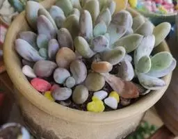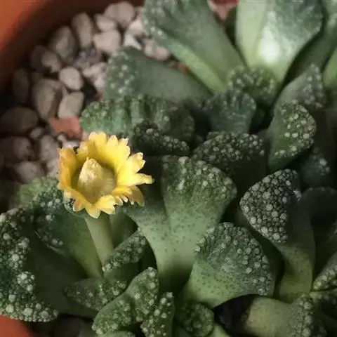 荒玉为番杏科生石花属,原产南非。株体呈白粉色,表面布满凹凸纹路,凹陷处为红褐色,每年秋季开黄花。