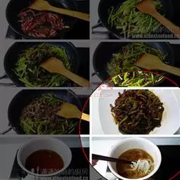 8、 炒锅置旺火上,倒油烧至六成热,放入辣椒节炸呈棕红色,下花椒炸香,淋在盆内上桌。