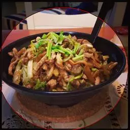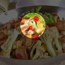 3、将炒锅放置旺火上,将鸡胸肉,猪肚,猪心,火腿肠放炒锅内加泡辣椒,干辣椒会炒至香,加入少许鲜汤,然后放入牛油,香油,味精,鸡精起锅后盛入炒好做底用的辅料上即成。