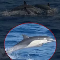 真海豚,身体细而流线型。体色十分复杂而独特,通常十字交叉型,黄褐色在前灰色在后,背面黑色向下延伸,…