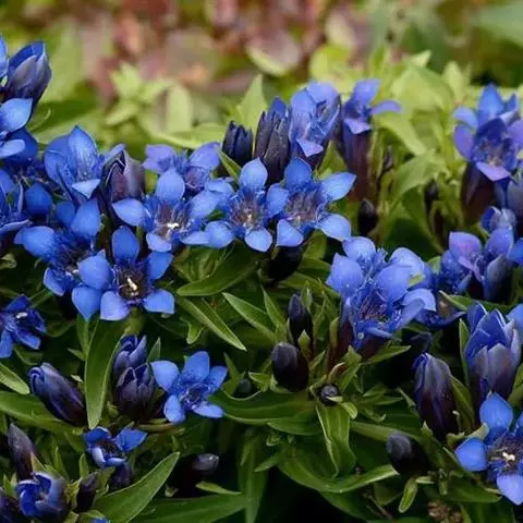 龙胆植物花色艳丽,色彩丰富,有紫、白、蓝、黄白等多种颜色,适宜作为花坛、花镜或盆花。 龙胆最高不过四、五十厘米,大部份是矮小贴地丛生。一株上有许多分枝,花生于枝上顶端,成古钟形或漏斗形,有4-5个裂瓣,全缘的,也有细裂的成流海似的须。龙胆花在秋冬季一片枯黄的草丛中临风开放,显得分外朴实和幽静,龙胆开花一片片一簇簇,临风摇曳,显出一种淡雅、素静的美,因而成为著名的花卉。