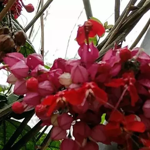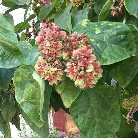 二歧聚伞花序组成顶生,大而开展的圆锥花序,长15-34厘米,宽13-35厘米,花序的最后侧枝呈总状花序,长可达16厘米,苞片宽卵形、卵状披针形、倒卵状披针形、线状披针形,有柄或无柄,小苞片线形;花萼红色,外面疏被短柔毛,散生盾形腺体,长1-1.5厘米,深5裂,裂片卵形或卵状披针形,渐尖,长0.7-1.3厘米,开展,外面有1-3条细脉,脉上具短柔毛,内面无毛,有疏珠状腺点;花冠红色,稀白色,花冠管长1.7-2.2厘米,外面具微毛,里面无毛,顶端5裂,裂片长圆形,开展,长1-1.5厘米;雄蕊长约达花冠管的3倍;子房无毛,4室,柱头2浅裂,与雄蕊均长突出于花冠外。果实椭圆状球形,绿色或蓝黑色,径7-10毫米,常分裂成2-4个分核,宿萼增大,初包被果实,后向外反折呈星状。花果期5-11月。