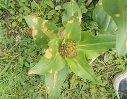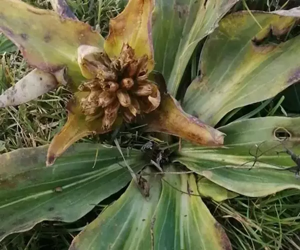 锈病:在高原地区粗茎秦艽易发生锈病,特别是在7-8月高原地区空气温度高,又遇连续降雨天气。发病初期,叶表皮上产生淡黄色小斑点;后期斑点逐渐由淡黄色变为黄褐色,隆起呈小脓疱状,表皮易破裂,向外翻,斑点聚集成圆形或椭圆形。发病初期,立即用2%戊唑醇或25%粉锈宁可湿性粉剂喷雾防治,7-10天一次,连续3次,效果明显。