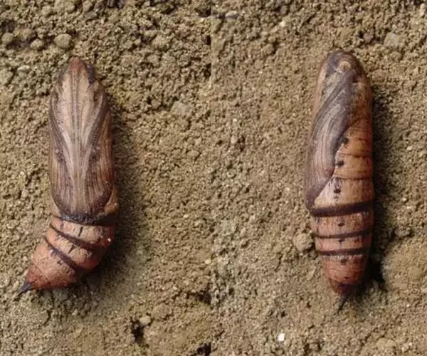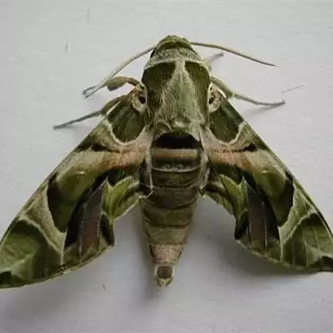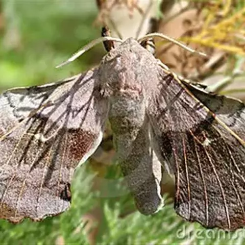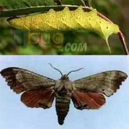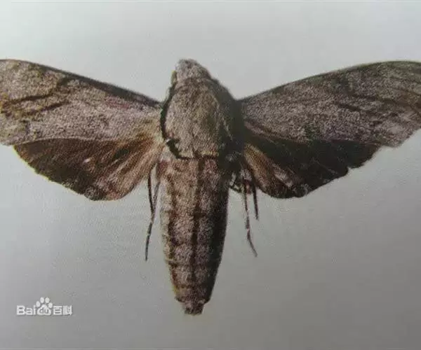 成虫翅长45~65毫米;胸部背板两侧及后缘有黑色纵条及黑斑一对;腹部背线棕黑色,其两侧有棕色纵带;前翅灰褐色,中线棕黑色,呈双行波状;后翅棕色。老熟幼虫体长75~96毫米,头部椭圆形,淡绿色;身体黄绿色,前胸背板上有7、8排横列的白色颗粒。蛹长48~51毫米,为红褐色。