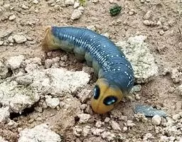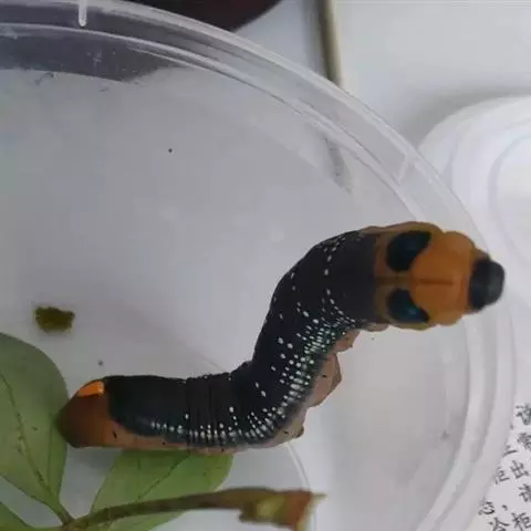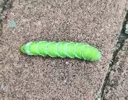 绿色,体长75至96毫米,头部淡绿,胸部绿色,背有横排列的白色颗粒8至9排;腹部黄绿色,体侧有白色斜带7条;尾角褐绿,上面有紫褐色颗粒,长12至13毫米,气门黑色,胸足黄褐色,腹足绿色。