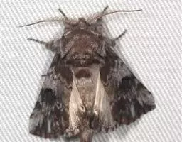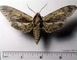 头灰褐色,体长45至50毫米,体翅暗灰色,混杂霜状白粉。翅展90至130毫米。胸部背板有棕黑色似半圆形条纹,腹部背面中央及两侧各有一条灰黑色纵纹。前翅中部有2条棕黑色波状横线,中室下方有两条黑色纵纹。翅顶有1条黑色曲线。后翅棕黑色,前后翅外缘由黑白相间的小方块斑连成。卵球形,初产时绿色,渐变黄色。