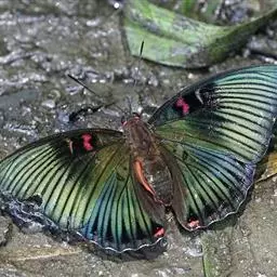 大二尾蛱蝶两翅正面黑色,中域有一浅绿色大型宽带纹,两翅反面浅绿色,中域有一缀黑边的褐色弧纹,…