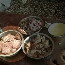 1. 光鸭用开水氽一下,去净血秽,鸭腹内壁用盐15克擦匀,使其入味。