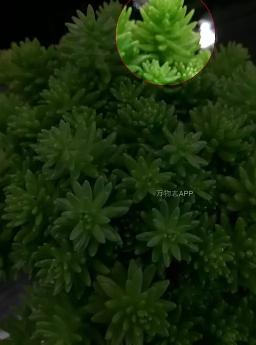 多年生迷你多肉植物,植株矮小,分枝与叶片很短,贴 白花小松-花冠特写 在肉质茎上,叶肉质轮生,一般旋转展开,叶尖经阳光照射边缘有红色,花顶生,白色,花期一般4~5月份。
