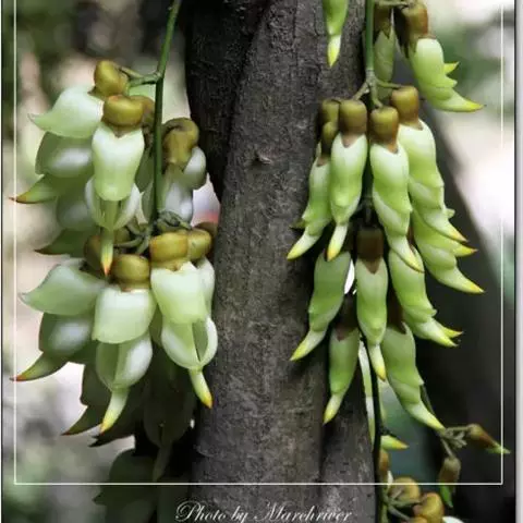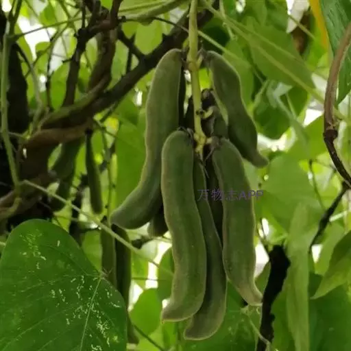 总状花序下垂,长12-30厘米,有花10-20多朵;苞片小,线状披针形;花萼阔钟状,密被灰白色小柔毛和疏刺毛,上部裂片极阔,下部中间1枚裂片线状披针形,长约8毫米;花冠深紫色或带白色,常较短,旗瓣长1.6-1.8厘米,翼瓣长2-3.5厘米,龙骨瓣长2.8-3.5(-4)厘米。荚果长8-12厘米,宽18-20毫米,嫩果膨胀,绿色,密被灰色或浅褐色短毛,成熟时稍扁,黑色,有隆起纵棱1-2条;种子6-8颗,长圆状,长约1.5厘米,宽约1厘米,厚5-6毫米,灰白色,淡黄褐色,浅橙色或黑色,有时带条纹或斑点,种脐长约7毫米,浅黄白色。花期10月,果期11月。