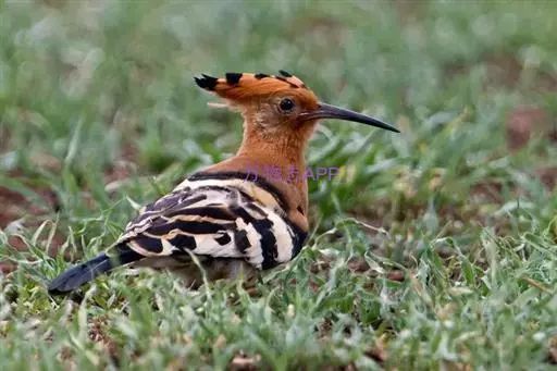 戴胜(学名:Upupa epops):共有8个亚种。依不同亚种体长26-28厘米,翼展42-46厘米,体重55-80克。头顶羽冠长而阔,呈扇形。颜包为棕红色或沙粉红色,具黑色端斑和白色次端斑。头侧和后颈淡棕色,上背和肩灰棕色。下背黑色而杂有淡棕白色宽阔横斑。初级飞羽黑色,飞羽中部具一道宽阔的白色横斑,其余飞羽具多道白色横斑。翅上覆羽黑色,也具较宽的白色或棕白色横斑。腰白色,尾羽黑色而中部具一白色横斑。颏、喉和上胸葡萄棕色。腹白色而杂有褐色纵纹。虹膜暗褐色。嘴细长而向下弯曲,黑色,基部淡肉色,脚和趾铅色或褐色。