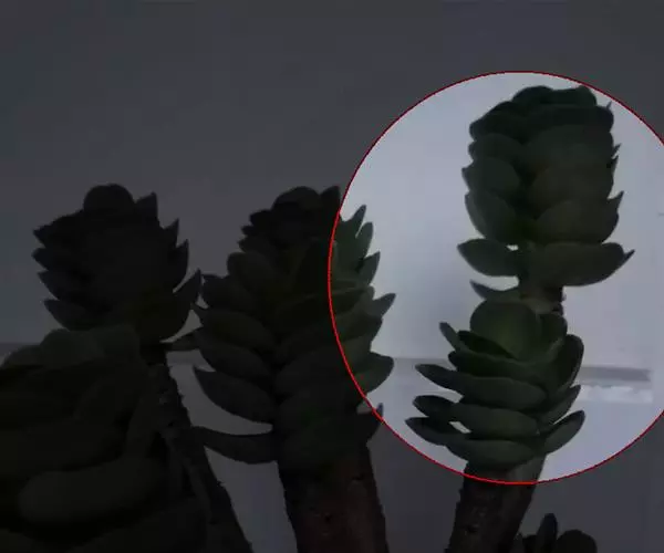 叶常年灰绿色,层层紧密排列,交互对生。正面扁平,背面棱凸。叶片微绒毛感,叶面有小绿暗点,俯视植株叶片组成近似正方形,侧看就象一座塔;弱光状态则叶片拉长,排列出现间距。花乳白色,花五瓣,簇生,伞形花序。