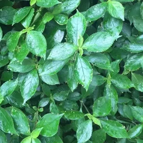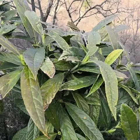 常绿灌木,高2-3米;小枝对生。叶革质,卵状椭圆形或长圆状椭圆形,长7-18厘米,宽4-10厘米,干时变棕黑色,叶面光亮,具黄色斑纹,侧脉扁平或微凹,背面光滑无毛,边缘在中部以上具5-7对牙齿;叶柄长2-4厘米,腹部具沟,无毛。圆锥花序顶生;雄花序长10-14厘米;雌花序为短圆锥花序;花瓣紫红色或暗紫色,近于卵形或椭圆状披针形,背部无毛,顶端尖尾状;雄花花萼杯状,顶端全缘;雄蕊短,长仅1毫米;花下面具1枚小苞片;雌花子房疏被柔毛,柱头偏斜;花下具2枚小苞片。浆果长卵圆形,成熟时暗紫色或黑色,长1.5-2厘米,直径8-10毫米;果柄长3-4毫米。