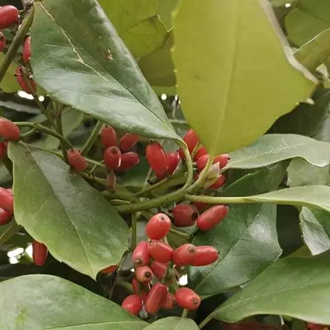 青木(原变种)常绿灌木,高约3米;枝、叶对生。叶革质,长椭圆形,卵状长椭圆形,稀阔披针形,长8-20厘米,宽5-12厘米,先端渐尖,基部近于圆形或阔楔形,上面亮绿色,下面淡绿色,边缘上段具2-4(-6)对疏锯齿或近于全缘。圆锥花序顶生,雄花序长约7-10厘米,总梗被毛,小花梗长3-5毫米,被毛;花瓣近于卵形或卵状披针形,长3.5-4.5毫米,宽2-2.5毫米,暗紫色,先端具0.5毫米的短尖头,雄蕊长1.25毫米;雌花序长(1-)2-3厘米,小花梗长2-3毫米,被毛,具2枚小苞片,子房被疏柔毛,花柱粗壮,柱头偏斜。果卵圆形,暗紫色或黑色,长2厘米,直径5-7毫米,具种子1枚。花期3-4月;果期至翌年4月。