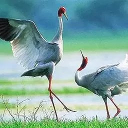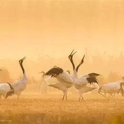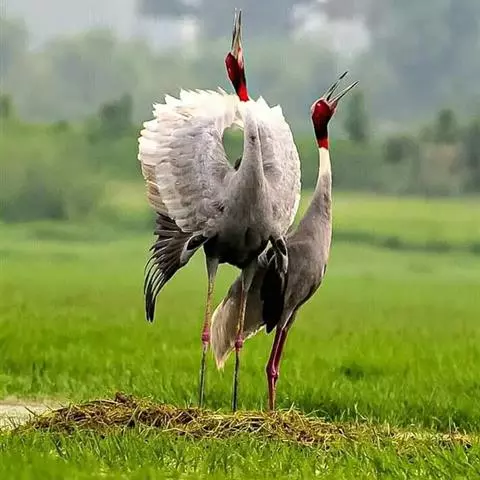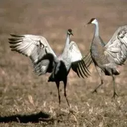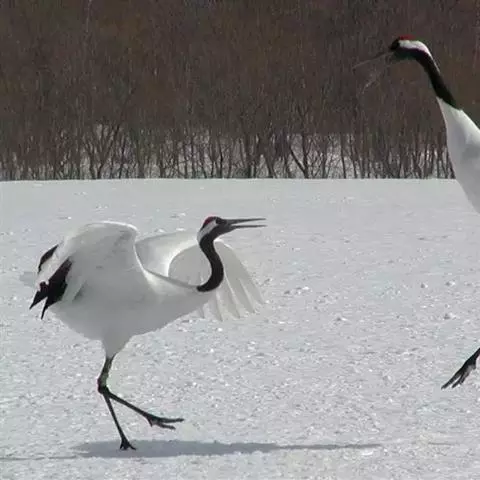 到了繁殖的季节,天性“喜歌善舞”的东非冕鹤经常成双结对地跳起优美的舞蹈。它们先是相互躬身颌首,以表相邀之意,然后双翅微展,企足延颈,跳将起来。舞步起始轻盈,渐趋急骤,最后竟如醉似痴。东非冕鹤喜欢鸣叫,“哦啊!哦啊!”的声音轻柔舒缓,清脆动人,或抒发自己的欢愉,或表达相互的情爱,特别是在子夜和黎明时分,声闻遐迩。所以,当地的农家、牧民都把它们同司晨的公鸡一样对待,当作一种时感很强的生物钟。