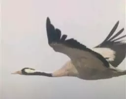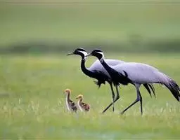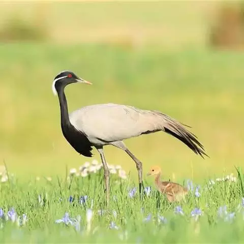 蓑羽鹤大型涉禽,体长68~92厘米,是鹤类中个体最小者。通体蓝灰色,眼先、头侧、喉和前颈黑色,…