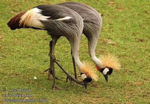 东非冕鹤(学名:Balearica regulorum)是大型涉禽。体长127厘米。额部向外凸出,有乌黑色绒羽,枕部有由无数条土黄色绒丝向四周放射所形成的绒球状冠羽。眼睛后方的面颊有上红下白的斑块。颈长。喉部有红色肉垂。体羽主要为浅蓝灰色,翅膀上的覆羽为白色,飞羽栗色。嘴、跗跖、趾均为黑色。栖息于湿地环境及人类居住区内的半天然栖息地。白天活动,喜欢在沼泽边缘,善于在田埂上、水田里、水沟边、草地上等处行走,还常常飞到附近居民的院子里觅食、戏耍。为杂食性动物。每年5-7月在沼泽地带繁殖。主要分布在非洲东部的乌干达、乍得、塞内加尔、肯尼亚、南苏丹、扎伊尔东部、坦桑尼亚北部和埃塞俄比亚西部等地区。是乌干达的国鸟。