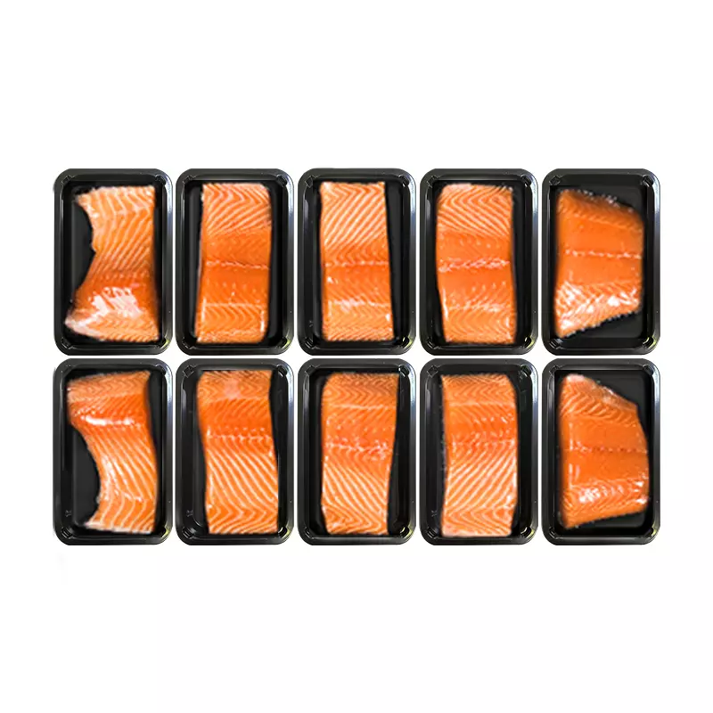 三文鱼体侧扁,背部隆起,齿尖锐,鳞片细小,银灰色,产卵期有橙色条纹。鲑鱼肉质紧密鲜美,肉色为粉红色并具有弹性。