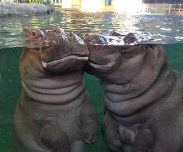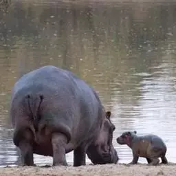 雌河马一般会单独带着小河马生活两个月,安静地享受着天伦之乐。母子俩常常静静地躺着休息,小河马紧紧地依偎在母亲的嘴边。有时,母亲又想带它下水去,因为河马总是摆脱不了如何稳定体温的问题,岸上呆久了,就要下水去降降温,这时小河马便很熟练地爬上母亲的背或脖子下水。小河马还需不停地吃奶,雌河马身子横卧,把一只后腿伸开去,乳房便露了出来,小河吃奶时,母河马会用另一只后腿托住乳房不停地按摩,以刺激奶水。蚊子会不时地飞来,这些家伙对流散的乳汁很喜欢,有时就歇在乳头周围,母河马于是就用大嘴使劲地拍击着河水,以此惊走到处乱飞的蚊子。小河马可以自己上岸了,母河马便不再溺爱它,让它自己潜水,小河马难免会在爬上岸时摔倒,母河马就用嘴去扶住它,鼓励它自己爬起来。母河马也不纵容小河马顽皮的游戏,会用巨大的身躯来阻挡它,或者干脆用大嘴巴来“教训”它。