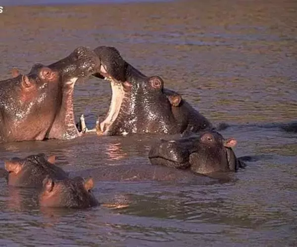 河马喜欢营群栖生活,由雌兽统领,每群20-30只,有时可多达百只以上,尤其是在水草稠密的地方,平均每5.5平方米就有一只。它有一套特殊的、如同阀门一般运用灵活的肌肉组织,在潜水时能将耳朵和鼻孔关闭起来,每次潜水时间可达5-10分钟左右,但不像水生哺乳动物那样在生理上有对水的适应能力,在陆地上生活的时间也很长,能以每小时20公里的速度奔跑,因此只能算是一种半水生动物。平时河马将全身没入水中,只把耳朵、眼睛和鼻孔露出水面,这样不仅能够正常呼吸,而且能够及时发现危险而不被敌人察觉。除了安全和凉爽外,水也能帮助支撑其庞大而沉重的身体,使其在水中行走自如。