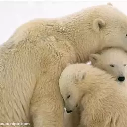 妊娠期为195-265天,每胎通常为两只,偶有1、3或4只,幼崽的死亡率约为10~30%。刚出生的北极熊大约长30厘米,重700克,在出生时无人协助,双目紧闭,不过全身已经覆盖着柔软的毛发;1-2个月时,可以行走;出生3-4个月后,母熊便携子离开洞口,让其外出见世面,长见识,晚上领着它们回洞过夜;出生4-5个月后断奶,2-3岁后独立,在此期间,幼崽要学习捕食和如何在北极严酷的环境中求得生存。一旦长成,它们很少找同类做伴,整天风里来,雪里去,辗转于浮冰和陆地间,由于其特殊的摄食方式和相当大的食量(北极熊的胃可容纳50~70公斤的食物),因此它总是独来独往。