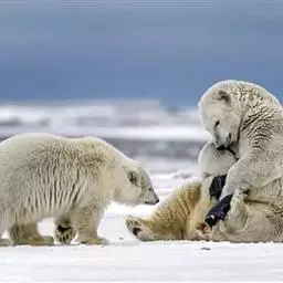 有时候北极熊辛苦捕到的猎物会引来同类的窥伺,一般来说,如果不幸面对那些体型庞大的家伙,个头小些的北极熊会更倾向于溜之大吉,不过一个正在哺育幼子的母亲为了保护幼子,或是捍卫一家来之不易的口粮,有时也会和前来冒犯的大公熊拼上一拼。同时,北极熊是唯一主动攻击人类的熊,攻击大多发生在夜间。