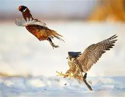 猎隼主要以中小型鸟类、野兔、鼠类等动物为食。除此之外,凶猛的猎隼还可以攻击金雕等大型凶猛禽类, 猎隼捕食野鸡 不过通常不是为了食物,主要是为了驱逐大型禽类;这种现象,在蒙古草原上曾多次出现。每当发现地面上的猎物时,猎隼总是先利用它那像高速飞机一样可以减少阻力的狭窄翅膀飞行到猎物的上方,占领制高点,然后收拢双翅,使翅膀上的飞羽和身体的纵轴平行,头则收缩到肩部,以每秒75-100米的速度,成25度角向猎物猛冲过去,在靠近猎物的瞬间,稍稍张开双翅,用后趾和爪打击或抓住猎物。此外,它还可以像歼击机一样在空中对飞行的山雀、百灵等小鸟进行袭击,追上猎物后,就用翅膀猛击,直至猎物失去飞行能力,从空中下坠,再俯冲下来将其捕获。