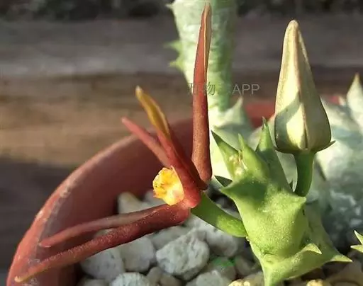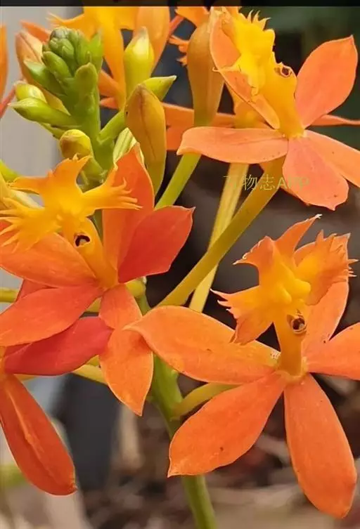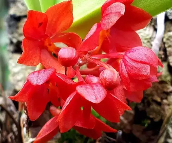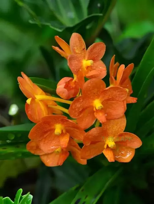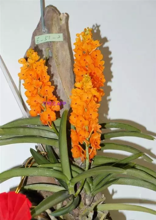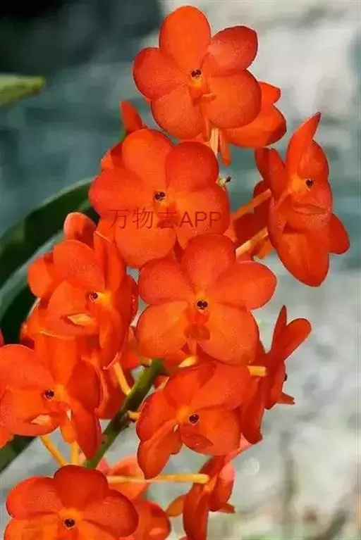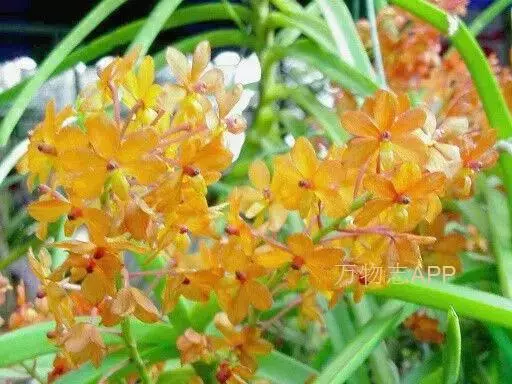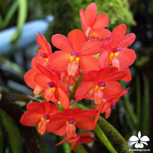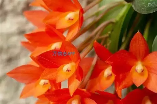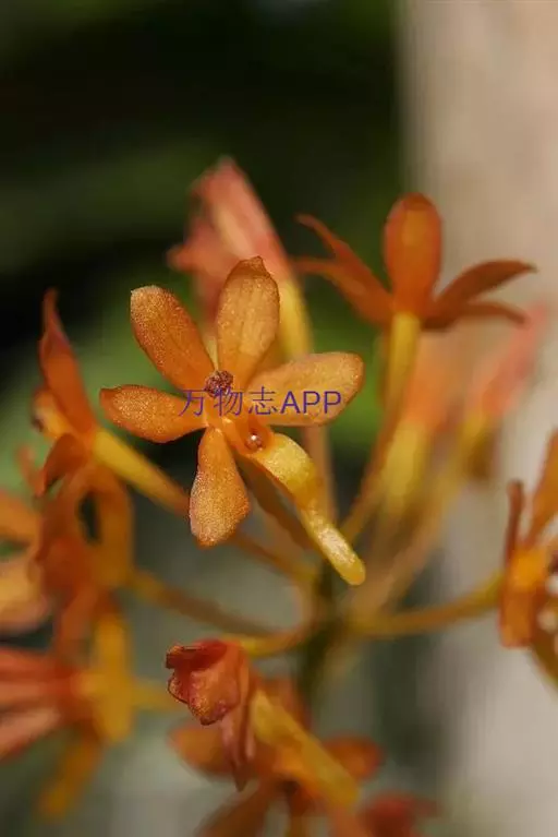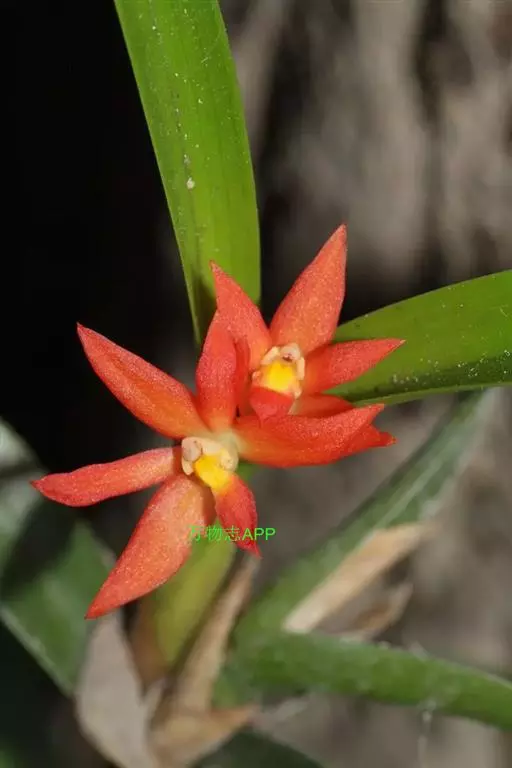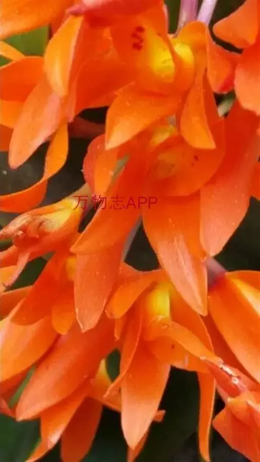 鸟舌兰(学名:Ascocentrum ampullaceum (Roxb.) Schltr.):植株高约10厘米。茎直立,粗壮,长1-4厘米,被叶鞘所包。叶厚革质,扁平,下部常V字形对折,上部稍向外弯,上面黄绿色带紫红色斑点,背面淡红色。总状花序密生多数花;花苞片很小,卵状三角形,长约1毫米,先端急尖;唇瓣3裂;侧裂片黄色,很小,直立,近三角形,先端稍钝,前侧边缘内折;药帽紫褐色,前端稍收狭,先端钝并且翘起;花粉团茄紫色,具狭扁而曲膝状的柄和近椭圆形的粘盘。花期4-5月。
