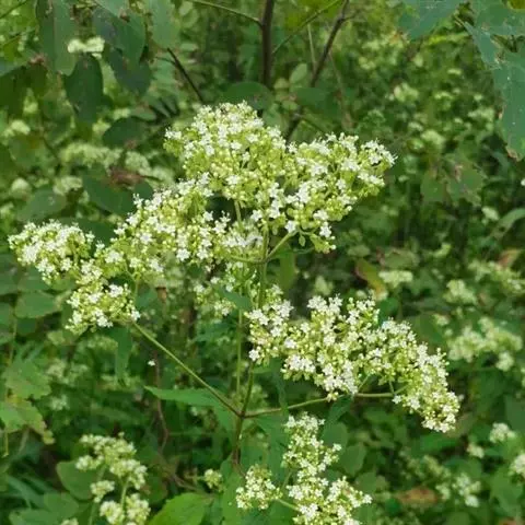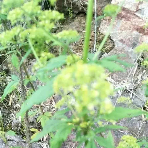 糙叶败酱( Patrinia rupestris Juss.subsp.scabra H.J.Wang),败酱科植物,多年生草本,茎丛生,茎上部多分枝,叶对生,裂片倒披针形、狭披针形或长圆形,聚伞花序顶生,呈伞房状排列,花小,黄色,花冠合瓣,果实翅状,卵形或近圆形,种子位于中央。
