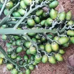 布迪椰子 布迪椰子采用种子繁殖,其发芽类型为毗邻型(近距带鞘型)。当种子萌发时,子叶柄突出种皮,将子叶肢送出种皮之外便停止生长,然后子叶肢贴近种侧分化出幼根及鞘。种子发芽较慢且很不整齐,一般10-11月播种到次年4-5月才发芽,第一年发芽率为40%左右。未发芽的种子留床到第三年还会出芽20%左右。因此,未发芽的种子不可轻易丢弃,因其果核含种子1-3粒,会从同一果核中长出1-3株苗。初生叶为全缘亚型。