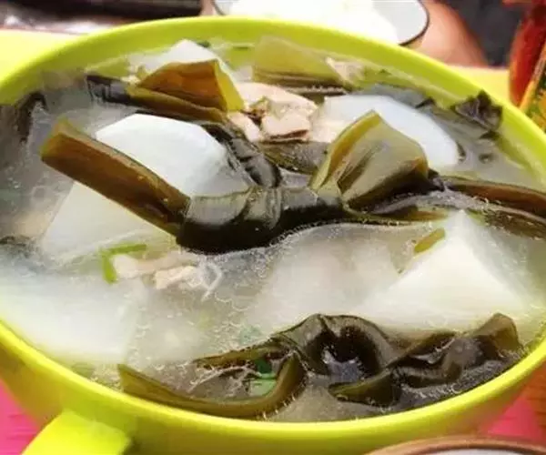 海带(鲜):海带含碘量极高,是体内合成甲状腺素的主要原料,常食可令秀发润泽乌黑。海带具有一定的药用价值,因为海带中含有大量的碘,碘是甲状腺合成的主要物质,如果人体缺少碘,就会患“粗脖子病”,即甲状腺机能减退症,所以,海带是甲状腺机能低下者的最佳食品。海带中还含有大量的甘露醇,而甘露醇具有利尿消肿的作用,可防治肾功能衰竭、老年性水肿、药物中毒等。甘露醇与碘、钾、烟酸等协同作用,对防治动脉硬化、高血压、慢性气管炎、慢性肝炎、贫血、水肿等疾病,都有较好的效果。海带中的优质蛋白质和不饱和脂肪酸,对心脏病、糖尿病、高血压有一定的防治作用。中医认为,海带性味咸寒,具有软坚、散结、消炎、平喘、通行利水、祛脂降压等功效,并对防治矽肺病有较好的作用。海带胶质能促使体内的放射性物质随同大便排出体外,从而减少放射性物质在人体内的积聚,也减少了放射性疾病的发生几率。