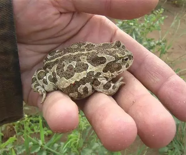 花背蟾蜍,两栖纲,蟾蜍科。体长6-7cm。雄蟾蜍背面橄榄黄色,皮肤粗糙,密布大小瘰疣,上有许多小白刺。雌蟾蜍背面浅绿色,有深褐色或酱黑色花斑,瘰疣稀疏,皮肤较光滑。腹面乳白色,满布扁平小疣。口后有大疣。耳后腺大而扁平。雄性皮肤粗糙,头部、上眼睑及背面密布不等大的疣粒,雌性疣粒较少,耳后腺大而扁;四肢及腹部较平滑。