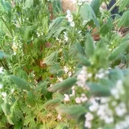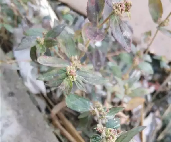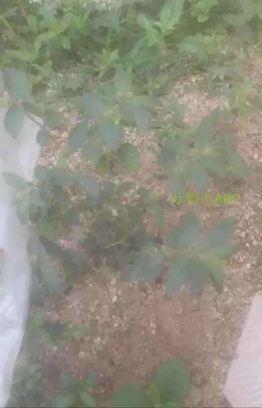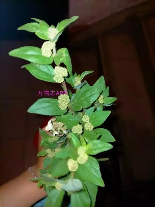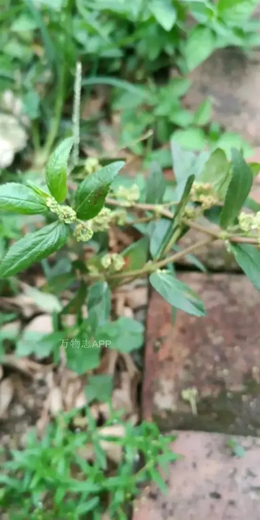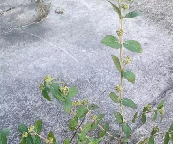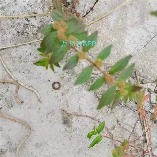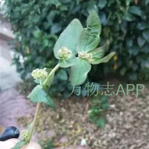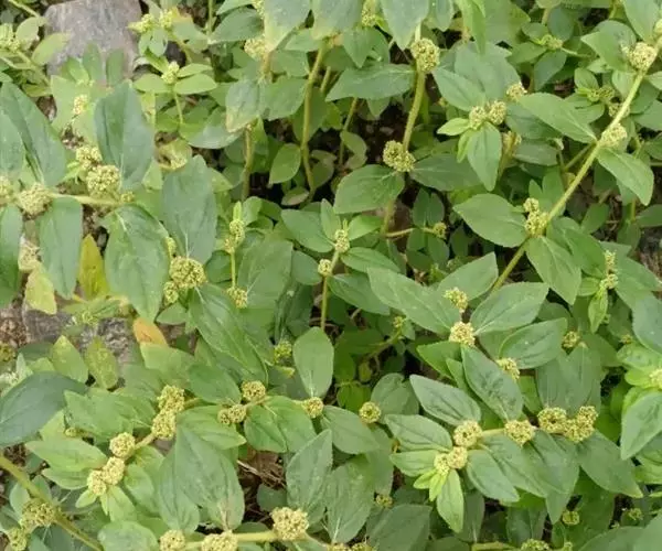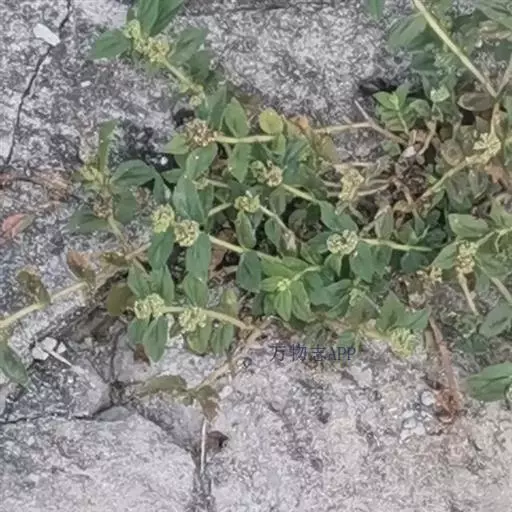 飞扬草 一年生草本。其茎呈近圆柱形,长15~1250px,直径l~3mm。表面黄褐色或浅棕红色;质脆,易折断,断面中空;地上部分被长粗毛。叶对生,皱缩,展平后叶片椭圆状卵形或略近菱形,长l~100px,宽0.5~32.5px;绿褐色,先端急尖或钝,基部偏斜,边缘有细锯齿,有3条较明显的叶脉。聚伞花序密集成头状,腋生。蒴果卵状三棱形。常生于向阳山坡、山谷、路旁或灌丛下。