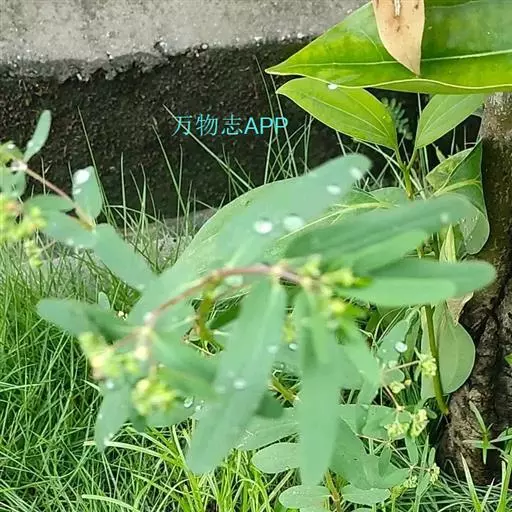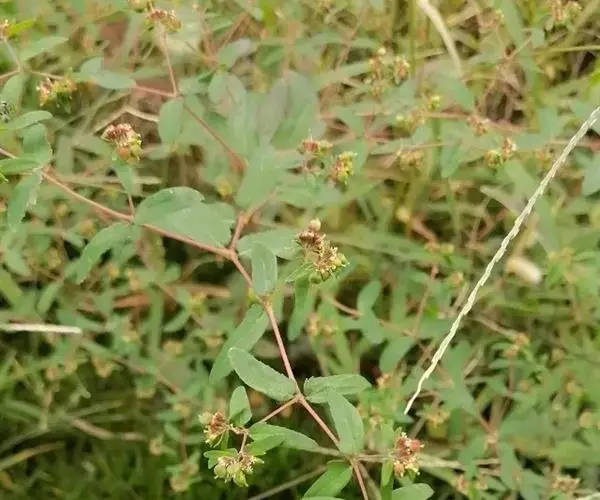 花序数个簇生于叶腋或枝顶,每个花序基部具纤细的柄,柄长3-5毫米;总苞陀螺状,高与直径各约1毫米或稍大;边缘5裂,裂片卵状三角形;腺体4,边缘具白色或淡粉色附属物。雄花数枚,微伸出总苞外;雌花1枚,子房柄长于总苞;子房三棱状,无毛;花柱3,分离;柱头2浅裂。蒴果三棱状,长约1.5毫米,直径约2毫米,无毛,成熟时分裂为3个分果爿。种子卵棱状,长约1.2毫米,直径约0.8毫米,每个棱面具数个皱纹,无种阜。花果期8-12月。
