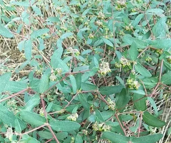 一年生草本,含白色乳汁。茎匍匐,多分枝,稍被毛,高不及15厘米,通常红色。叶对生,椭圆形至矩圆形,长4~6毫米,很少达8毫米,宽2~4毫米,先端钝,基部偏斜而截头状,边缘有极小的锯齿,上面深绿色,下面浅绿带灰白色;叶柄甚短;托叶细小,生于叶柄基侧。杯状花序单生或少数聚伞状排列于叶腋;几无柄;总苞陀螺状,淡紫色,长约1毫米;腺体4,漏斗状;花单性,无花被;雌雄花同生于总苞内;雄花多数,只具雄蕊1;雌花1,生于花序中央,子房3室,花柱2,离生且顶端2裂。蒴果有毛,卵状三棱形,长1.5毫米许。种子有纵沟纹5~6条。花期夏季。