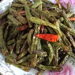 5.锅内放油,烧热,倒入炸过的豆角,用小火煸熟,再将味汁倒入锅里,撒上干辣椒,调入精盐和味精炒匀即可。