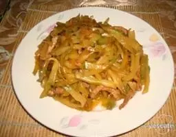 三 烧热镬 ,下油两汤匙爆香姜茸,放入猪肉、虾米及炸菜炒片刻,加入四季豆,赞酒,再加入调味料,改中火至汁收干,洒上葱粒兜匀即可上碟。