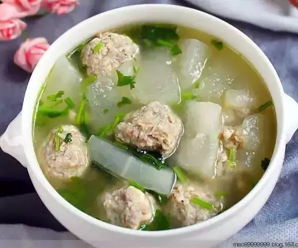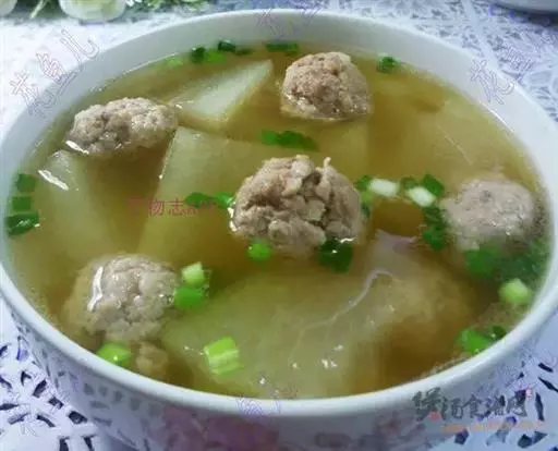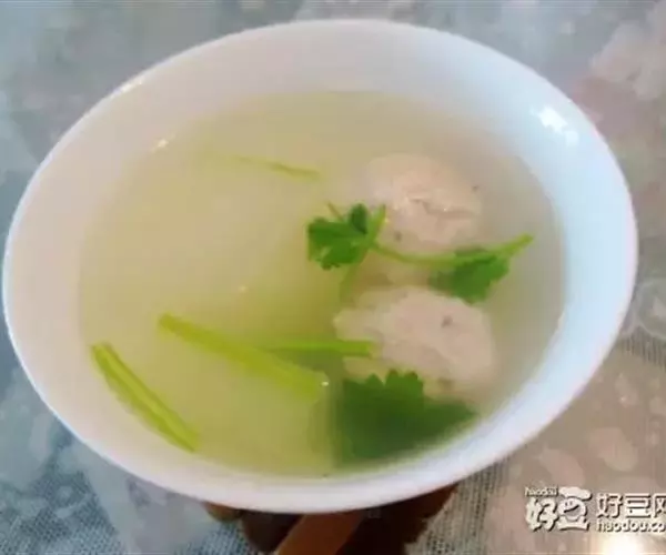 原料:精肉、生姜末、精盐、味精、香菜、香油。 丸子汤