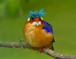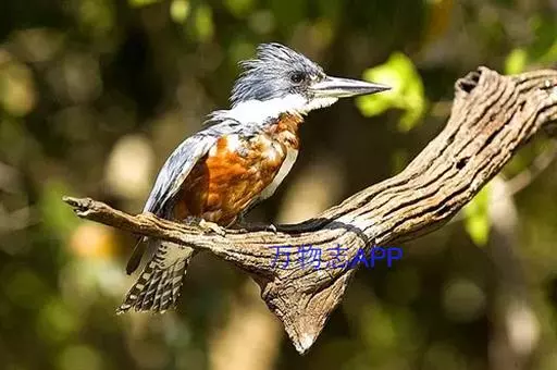 棕腹鱼狗身长38 - 42 cm ,体重305-341 g。主体羽毛蓝色。头顶的冠羽竖起一个小尖峰…