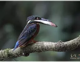 绿鱼狗是佛法僧目翠鸟科的鸟类。成年雄鸟,额头和眼先是黑色,头顶端深绿色呈古铜光泽。翅膀羽毛有白色斑…