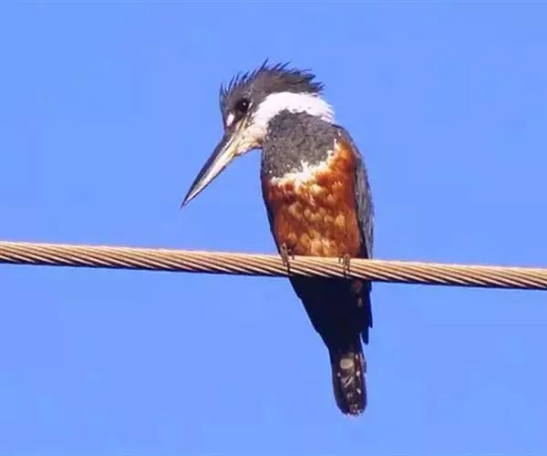 棕腹鱼狗身长38 - 42 cm ,体重305-341 g。主体羽毛蓝色。头顶的冠羽竖起一个小尖峰。强有力的嘴长达8英寸。灰色为主的蓝色羽毛,蓝黑色的头部,如项链一样的白领。雄鸟自腹部起几乎完全红棕色,肛门区白色。雌鸟下体板栗色,红区略少,胸部的灰色带很宽。嘴和脚是黑褐色。